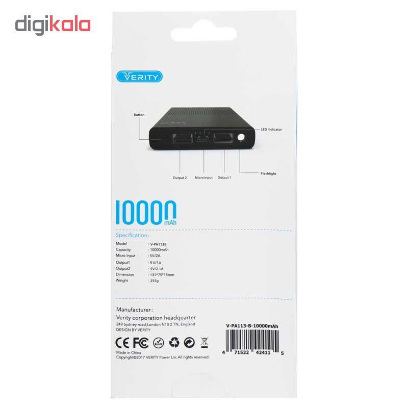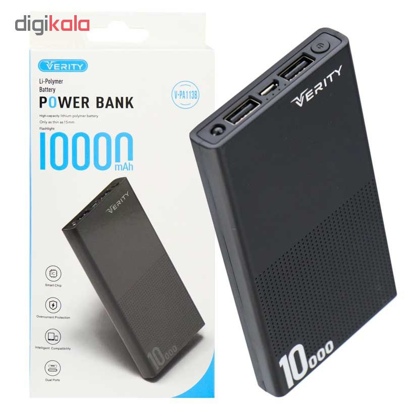 پاور بانک وریتی مدل V-PA113 دارای ظرفیت اسمی 10000 میلی آمپر بر ساعتی بوده و باتری آن از نوع لیتیوم پلیمری است که وزن آن را نسبت به شارژر همراه های دیگر که باتری لیتیوم یونی دارند سبک تر می کند. این پاور بانک دارای دو خروجی USB است که شدت جریان خروجی آن ها برابر با 2.1 آمپر و 1.0 آمپر است که در این رابطه باید به این نکته نیز اشاره کنیم که خروجی کلی آن هم برابر با 2.1 آمپر است. PA113 می توان از طریق درگاه ورودی میکرو یو اس بی که روی آن قرار داده شده است، شارژ کرد. شدت جریان ورودی کلی هم در آن معادل 2.0 آمپر است. در نظر داشته باشید که وریتی از گوشی شما در برابر شارژ بیش از حد محافظت کرده و از آن جلوگیری می کند.