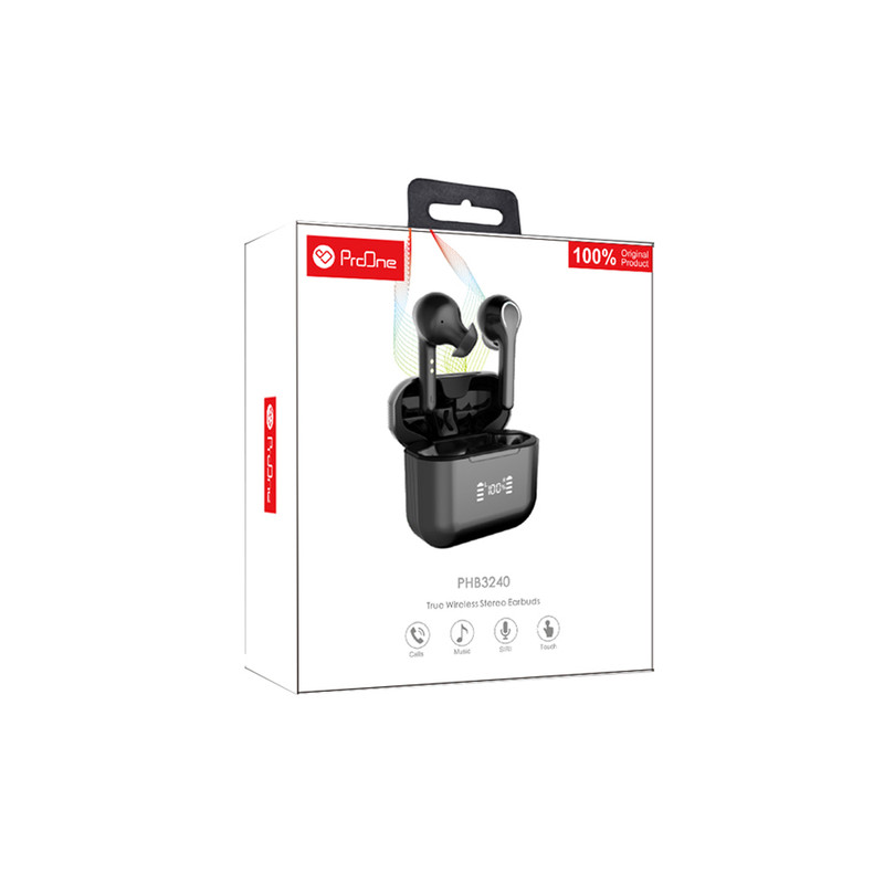 هندزفری بلوتوثی PHB3240 یکی دیگر از محصولات شرکت «Proone» است از کیفیت ساخت بالایی برخوردار میباشد. هندزفری پرووان مدل PHB3240 دارای دو گوشی با فناوری TWS است که درون یک محفظه قابل شارژ قرار دارند. این هندزفری از بلوتوث نسخه 5 بهره می برد و تا فاصله 10متر برد موثر دارد. جنس بدنه این محفظه از نوع ABS که در مقابل حرارت مقاومت خوبی دارد و جنس باتری از نوع لیتیومی می باشد. محفظه هندزفری دارای ابعادی معادل طول 47، عرض 6/ 53 و ارتفاع 3/25 میلی متر است که وزنی معادل 1/39 گرم و هر کدام از گوشی ها نیز وزنی معادل 8/3 گرم دارد. گوشیهای هندزفری به محض خارج شدن از درون محفظه روشن شده و به یکدیگر متصل میشوند. برای اتصال آنها به گوشی موبایل صرفا کافیست بلوتوث گوشی خود را روشن کنید و به راحتی به آن متصل شوید. شارژ شدن هر یک از این گوشی ها به مدت 50 دقیقه زمان می برد و شما تا 4 ساعت به صورت مداوم می توانید از آن ها استفاده کنید. این هندزفری ها در داخل یک باکس قرار می گیرند که هم برای نگهداری و هم برای شارژ گوشی ها از آن استفاده می شود. بر روی این باکس صفحه LCD طراحی شده که میزان شارژ را نشان می دهد. استفاده از این هندزفری به صورت تاچ است. محفظه شارژ دارای ظرفیت باتری معادل 400 میلی آمپر و هر کدام از گوشی ها با ظرفیت 40 میلی آمپر مجهز شده است. از اقلام همراه این هندزفری کابل Type-c USB است که داخل یک جعبه زیبا قرار گرفته است.