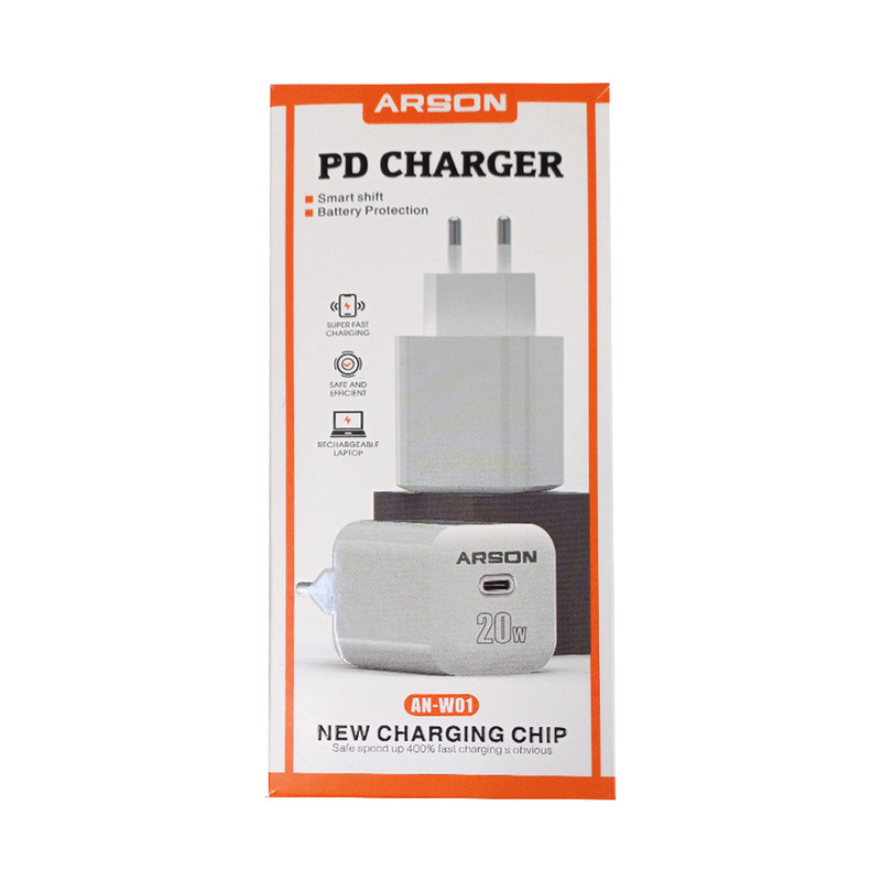 شارژر دیواری آرسون (ARSON) مدل AN-W01 دارای یک خروجی Type-C می باشد که درگاه Type-C آن، از فناوری پیشرفته Power Delivery یا PD پشتیبانی می کند؛ فناوریِ شارژِ فوقسریعِ Power Delivery به شما این قابلیت را میدهد که نحوهی مصرفِ برق و نحوهی شارژ شدنِ دستگاهِ مرتبط به لپتاپ، کامپیوتر و غیره را مدیریت و بهینهسازی کنید، قابلیتی که جدیدترین فناوری شارژ بوده و سرعت بسیار بالای شارژ آن و هوشمند بودن تمام فرآیند شارژ، از مهمترین ویژگی های آن است. توان خروجی این محصول، 20 وات بوده و ولتاژ ورودی به ازای شدت جریان 50-60 HZ AC، برابر با 200-240 ولت و ولتاژ خروجی به ترتیب، برای شدت جریان 3 آمپر 5 ولت و 2 آمپر، 9 ولت و برای شدت جریان 1.5 آمپر، 12ولت می باشد که در این حالت، بالاترین توان خروجی یعنی 20 وات، فراهم می شود. با این شارژر دیواری می توان انواع گوشی موبایل، تبلت و دستگاه های هوشمند را شارژ نمود. از ویژگی های این محصول به کوچک و سبک بودن آن می توان اشاره کرد که وزنی برابر با 70 گرم و ابعادی برابر با 80x40x40 میلی متر دارد. جنس بدنه AN-W01 از پلاستیک مرغوبی می باشد که هنگام شارژ داغ نمی شود. دربسته بندی این شارژر، یک کابل شارژ تایپ سی (TYPE-C) به لایتنینگ (Lightning) به طول 100 سانتی متر قرار دارد.