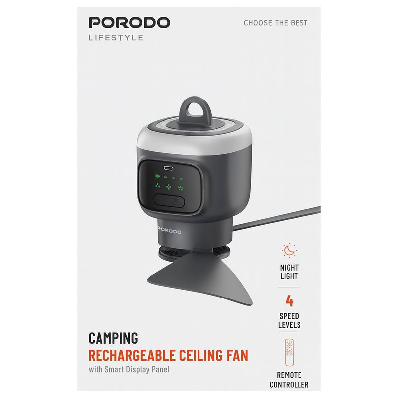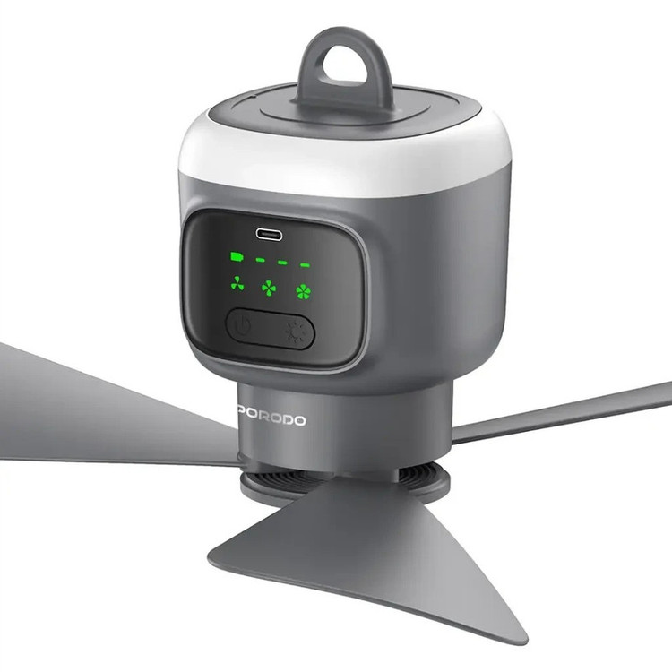 «پنکه سقفی کمپینگ شارژی Porodo Lifestyle با باتری قدرتمند 12000mAh، بهترین همراه شما در سفر و کمپینگ است. با ۴ سرعت باد قابل تنظیم، میتوانید شدت جریان هوا را طبق نیاز خود تنظیم کنید و از هوای خنک لذت ببرید. طراحی کمصدا این پنکه باعث میشود حتی در شب بدون مزاحمت خوابیده یا استراحت کنید. کنترل از راه دور استفاده از پنکه را ساده و راحت کرده و رنگ خاکستری شیک آن با هر دکوراسیونی هماهنگ میشود. این پنکه ایدهآل برای چادر، بالکن، فضای باز و محیطهای کوچک است و تجربهای راحت و خنک برای شما فراهم میکند.»