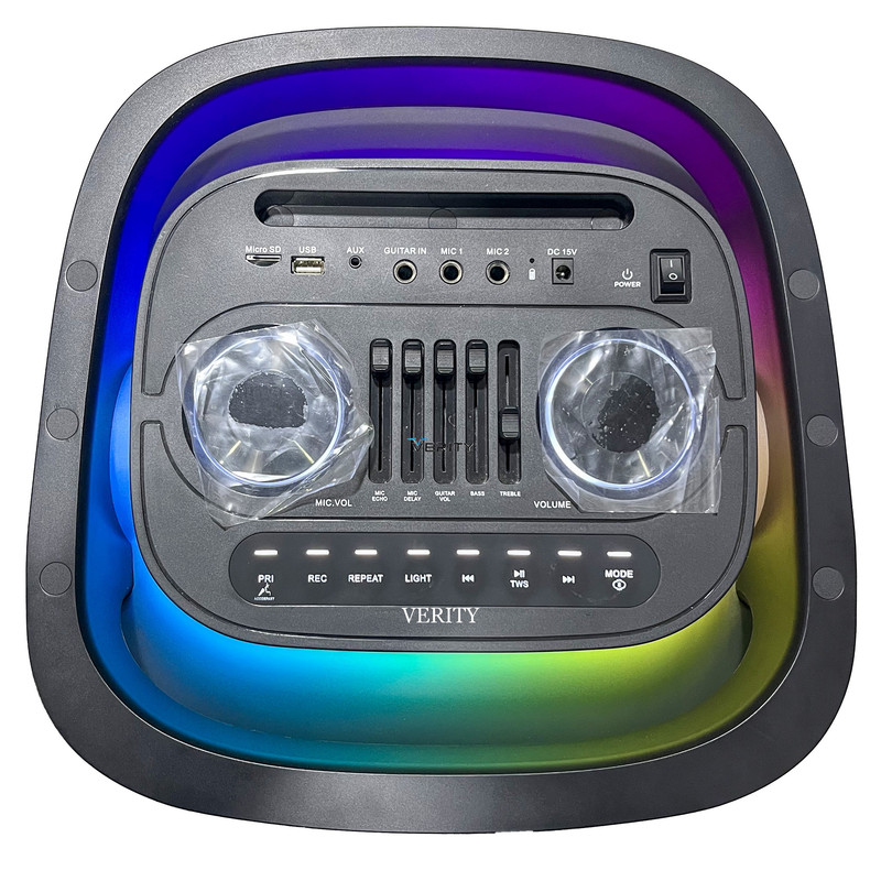 اسپیکر وریتی مدل ۲۳۱۰ یک اسپیکر قدرتمند با ظاهری زیبا و خاص که از جدید ترین سبک طراحی اسپیکر های قابل حمل بهره برده است با دو ساب ۱۰ اینج خود یک بیس بسیار دلنشین و دقیق رو اجرا میکنه یک تیوتر ۱ اینچی داره که کیفیت و رسایی صدارو چندین برابر میکنه دارای تنظیمات کامل صداس به همراه یک عدد میکروفون وایرلس که در کارتن خودش داره میتوانید از خوانندگی لذت ببرید دارای چرخه که حملشو اسان تر میکنه