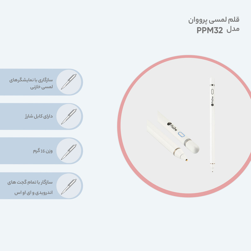 نقاشی دیجیتال یکی از ترندهای هنری دوران ماست که بسیار هم جذاب است. اما اگر بخواهیم در تبلت نقاشی کنیم نیاز به یک قلم لمسی خوب داریم که نه گیر کند و نه قطعی داشته باشد. اینجاست که قلمهای لمسی استایلوس میتوانند پاسخگوی نیاز ما باشند. بسیاری از کمپانیها این قلمها را تحت اسمهای متفاوت تولید میکنند، قلم لمسی پرووان هم با مدل PPM32 شناخته میشود. بدنه این قلم از آلیاژ فلز آلومینیوم و پلاستیک تشکیل شده که به خوبی صیقل داده شده و بسیار زیبا و سبک است و ابعاد آن برابر با 175×9 میلیمتر بوده است. بالای بدنه قلم یک کلید قراردارد که مخصوص روشن و خاموش کردن قلم است که با روشن شدن قلم چراغ LED دور آن روشن میشود. در قسمت بالایی قلم یک در آهن ربایی وجود دارد که با جدا کردن آن میتوانید درگاه مخصوص شارژر قلم را با کابل میکرو USB شارژ کنید. قلم استایلوس PPM32 دارای یک سری فعال مانند خودکار است که وظیفه اصلی را این سری کوچک انجام میدهد.