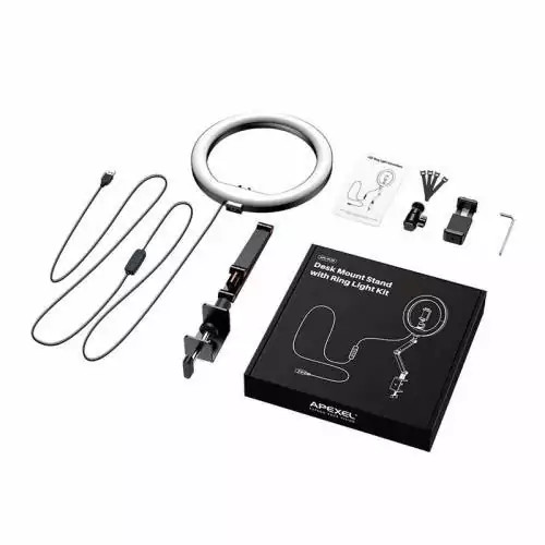 با طراحی انعطاف پذیر این محصول میتوانید با توجه به نیازهای خود ارتفاع، زاویه و یا مکان آن را تغییر دهید. از چرخش تا 360 درجه پشتیبانی میکند. گیرهای در پایه تعبیه شده است که امکان بستن نگهدارنده را در هر سطح صافی به شما میدهد. میتوانید با پیچ پشت رینگ لایت آن را 360 درجه چرخانده و یا ارتفاع را کم و زیاد کنید. 48 عدد LED در لامپAPL-FL04 نگهدارنده وجود دارد. نور سوسو نمیزند و یکسان پخش میشود. این محصول 3 حالت روشنایی سفید، گرم و خنثی را پشتیبانی میکند. برای شارژ این نگهدارنده میتوانید پورت USB را به برق یا هر دستگاهی مانند لپتاپ، موبایل و… متصل کنید. کابل بلند 135 سانتیمتری همراه محصول 5 ولت برق را انتقال میدهد. با همه گوشیهای تا عرض 9 سانتیمتر سازگاری دارد.